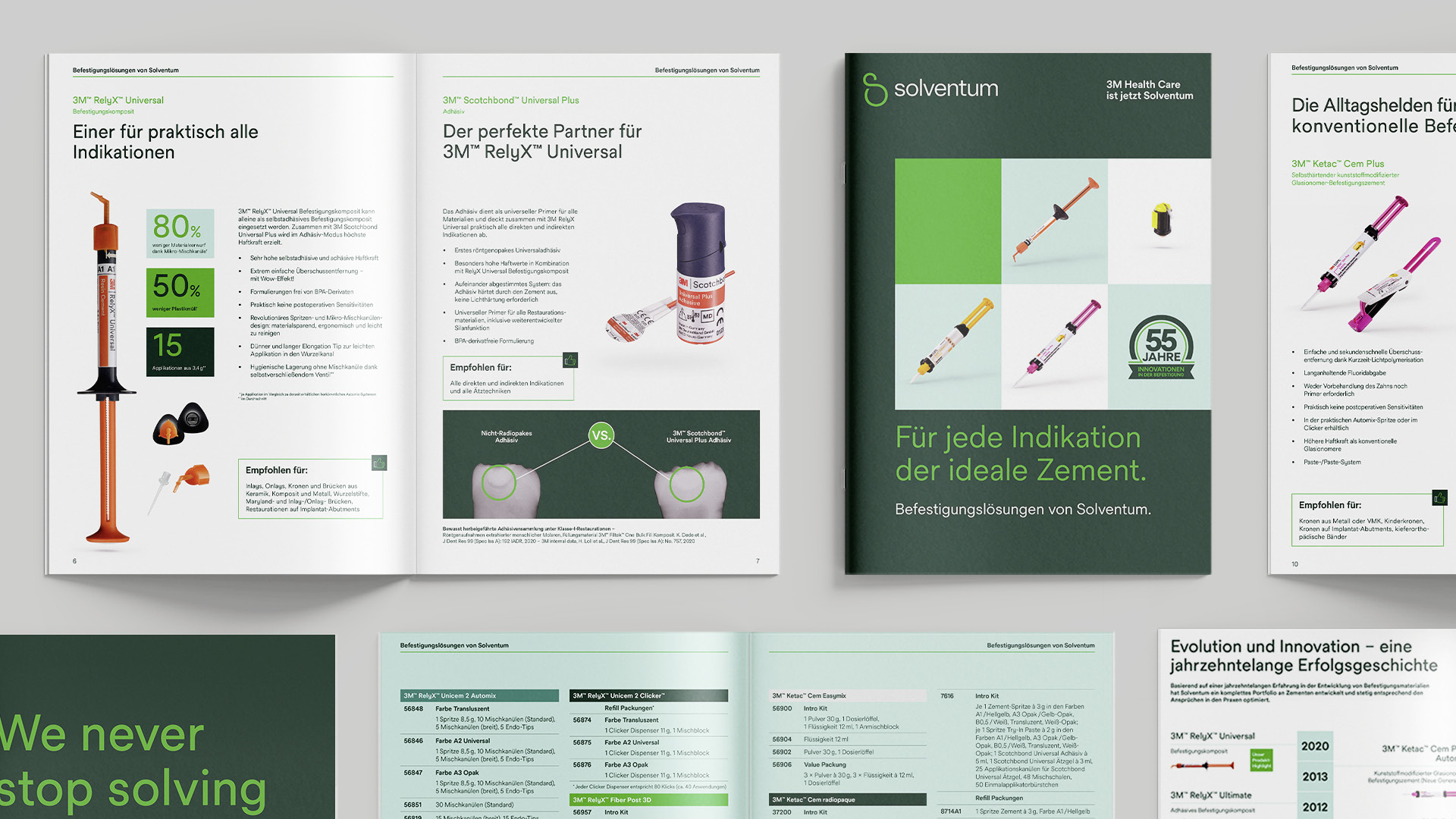 Durch die Ausgliederung des Health Care Bereichs von 3M und dem daraus resultierenden neuen Auftritt als Solventum, wurden u.a. auch die Family Broschüren im neuen Solventum Look erstellt. Jede Family Broschüre präsentiert dabei einen eigenständigen dentalen Produktbereich – Abformung, Füllungen, Prophylaxe und Befestigung – und stellt die wichtigsten Produkte vor. Die Broschüren gehören zu den ersten Tools, die wir im neuen Solventum CI gestaltet haben. Zum damaligen Zeitpunkt war die Guideline noch sehr allgemein gehalten, sodass wir hier die Chance hatten, die Marke von Anfang an auf Produktebene mitzugestalten. Beim Design haben wir besonders darauf geachtet, dass die Broschüren – trotz unterschiedlicher Inhalte – mit einer visuellen Klammer gestaltet sind, um einen einheitlichen Markenauftritt zu gewährleisten.